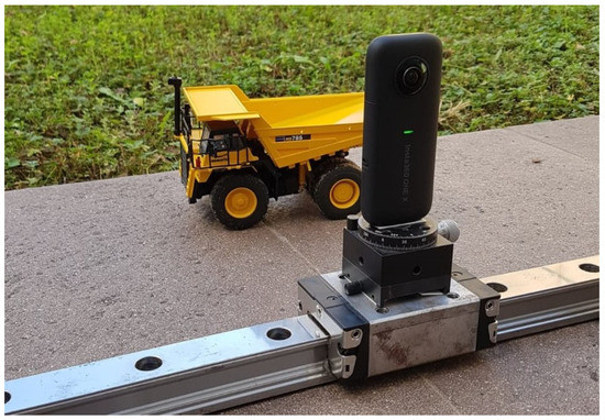 Figure 8 shows the experimental setup used to test the developed algorithm. A 360° camera, such as the Insta360 ONE X, is placed on a rotary stage which in turn is placed on a translation stage. The camera frames a miniature model of a Komatsu HD785 truck.