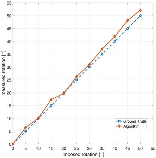 Results show that the developed algorithm achieved good results for both translations and rotations. In particular, the maximum difference in the rotation estimation was 3.2° for the nominal rotation of 45° (see Table 1). Figure 13 shows the optimization result for this case.