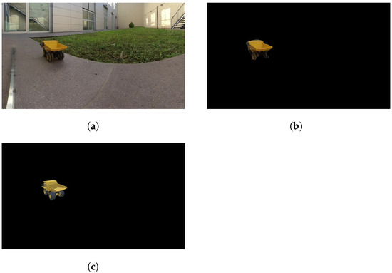 An example of the optimization result where the camera was rotated by 15°. (a) Portion of the input equirectangular image taken by the 360° camera. (b) Result of the segmentation. (c) Optimization result in which the CAD is rendered in the final pose found by the optimization algorithm.