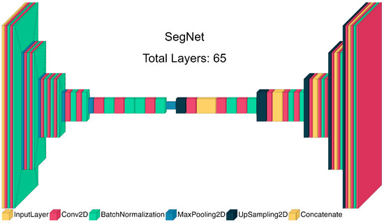SegNet is another DNN that is employed in this paper. The architecture for the model in this study is inspired by the [34] repository. SegNet uses the capabilities of encoders and decoders. There are 13 encoder layers that are similar to the first 13 VGG16 convolution layers [35,36]. The encoder is not entirely attached, which helps to lower the overall amount of parameters. For each encoder layer, related decoders use upsampling to expand the spatial size. The decoder provides sparse feature maps that are of high resolution. The last layer in the decoder features a softmax activation function that allows categorization of each pixel [35]. Figure 5 demonstrates the SegNet architecture, which is utilized in this paper.