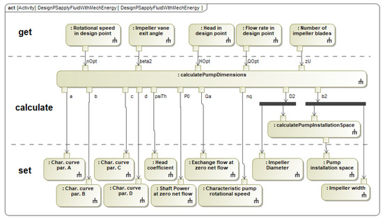 Design workflows can identify suitable parameter values of the solution architecture [27]. A design workflow model established procedures for design, such as those given in norms, standards, and guidelines in an executable form in the MBSE system model. The design workflow is modeled as an activity diagram for this purpose. The design workflow of a pump impeller is shown as an example in Figure 5. It is divided into three sections: get, calculate and set.