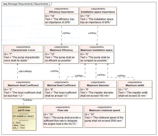 From the higher-level requirements for high efficiency, low installation space, and stable operation, a range of values are derived for the head coefficient. The head coefficient is a characteristic value calculated from the physical quantities of a pump and characterizes its operating behavior [36]. The head coefficient should be as high as possible for compact and efficient pumps [37]. A lower bound of is therefore selected. However, a head coefficient that is too high can lead to unstable flow rate behavior and vibration excitations in the cooling circuit [38]. The value of the head coefficient is therefore limited to using a practical value according to [39]. The installation space requirement is further refined in maximum impeller diameter and width. These limits depend on the application and are here set to and . Additionally, the pump shall be operated at a maximum speed of for noise and material strength reasons. Further requirements weigh the importance of installation space and efficiency of the pump. The so defined weights can be used to compare different technical variants. The WLTC is used as the design cycle. The pump must provide enough flow rate to dissipate the heat generated by the engine in the cycle. The requirements are checked utilizing constraint elements in the MBSE system model. For brevity, only one such element is shown in Figure 6 for the upper limit of the head coefficient. These constraints are later reused identically in MDAO.