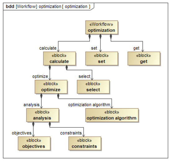 The architecture of the optimization workflow describes the hierarchical relationships of its elements and is, therefore, part of the formalization process in Figure 2. The workflow architecture is modeled as a block definition diagram (bdd) and is shown in Figure 10. Similar to the design and test workflows, the optimization workflow consists of the sections get, calculate and set. Calculate consists of the parts optimize and select. The block select is used to select the most suitable tradeoff if multiple optimal variants are available. Optimize consists of an analysis and an optimization algorithm (corresponding Figure 9). [In the analysis, objectives, and constraints (implemented as functions) are evaluated. The optimization algorithm performs the optimization task.