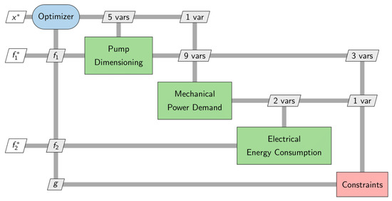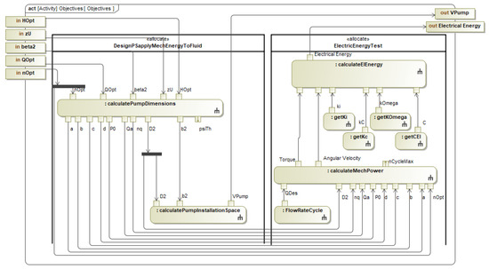 The internal behavior of the objectives block is shown in Figure 12. In this depiction, the design variables and the objectives are defined. For example, all design variables of the design workflow were adopted (cf. Figure 5). The objectives were defined based on the identified conflict of objectives in the manual iteration (pump installation space and electrical energy consumption). Model elements of the design (calculatePumpDimensions, calculatePumpInstallationSpace) and test (calculateMechPower, calculateElEnergy) workflows were reused in the description of the internal behavior (cf. Figure 5 and Figure 7).