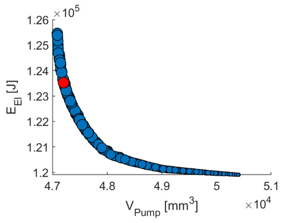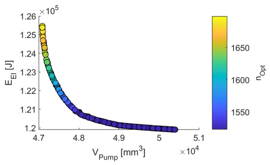 For example, the optimum design of an electric coolant pump in a vehicle is considered regarding the objectives of electric energy consumption and installation space. For this, five design variables are considered: rotational speed, flow rate, and head (i.e., pressure difference between pump intake and outlet) in the best efficiency design point, as well as the impeller vane exit angle and number of impeller blades. The speed of conventional belt-driven coolant pumps is fixed to the speed of the internal combustion engine. This means that the flow rate cannot be supplied as required. The flow rate is therefore adapted by throttling or bypassing, and as a result, energy losses occur. In contrast, electric coolant pumps can provide volume flows as required by adjusting the pump speed, thus helping to reduce energy consumption and ultimately achieve CO2 targets [28]. The optimal design is discussed in the literature [29,30,31,32].