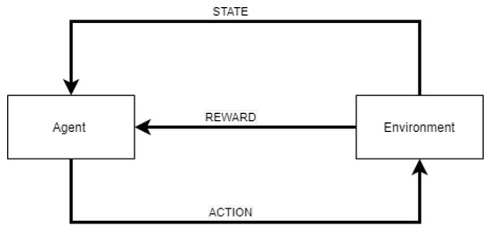 Reinforcement learning methods are applicable when the agent does not know the transition and reward functions in advance [8]. Reinforcement learning differs from the traditional learning paradigms such as, instead of learning mapping functions by observing large samples of pre-labeled examples, the objective is to learn behavioral policies through interaction with the environment [9,10]. The learner is not told which actions to take but must learn which actions yield the most reward by selecting an action and observing the reward [11]. In the reinforcement learning setting, an agent is placed in an environment where it can perform a set of actions where k denotes the number of actions possible in the environment. At each timestep t the agent observes the current state of the environment , selects an action and receives a reward that indicates the desirability of the action taken [12]. The task of the agent is to perform actions, observe the resulting states and rewards and learn a control policy through trial and error, which maximizes the agent’s reward over time [12,13]. Figure 1 illustrates an agent interacting with its environment. The agent observes the state of the environment, performs an action , and receives a reward .
