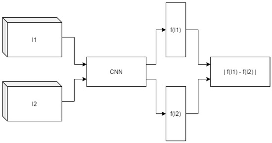 Given two images and , and a model M, parametrized by a set of weight and biases . The SCNN produces the distance between feature vectors according to Equation (2), where and are the outputs produced from the convolutional layers of the SCNN.