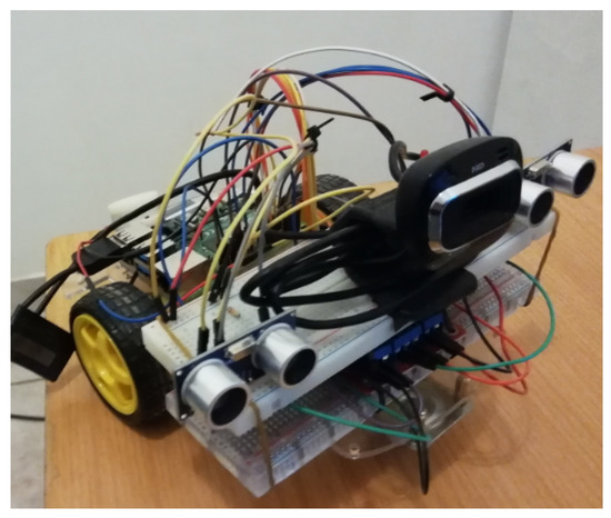 The physical agent is implemented using a Raspberry Pi 4 micro controller with 2 GB of RAM. The agent is equipped with two DC motors which are controlled L298N motor controller circuit. We make use of two ultrasonic range sensors used to detect when the agent is close to obstacles, the range readings do not form part of the state representation . The state is provided by a Microsoft HD Webcam. The physical agent can be seen in Figure 7. All coding necessary for controlling of motors and implementation of deep Q-network and Siamese convolutional neural network is implemented using Python.