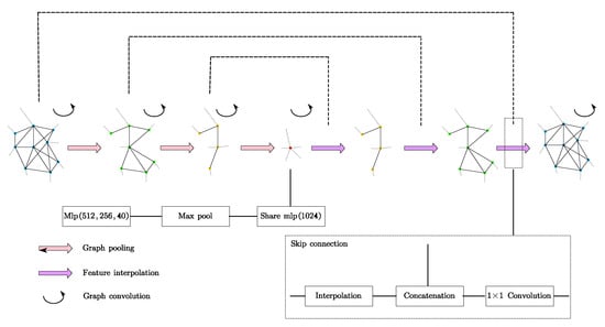 The key to the non-spectral methods is that they directly define the convolution on graphs with local neighbors in spatial or manifold domains. Specifically, convolution is usually implemented using MLP over spatial neighbors. Pooling produces a new coarsened graph by aggregating information from each point’s neighbors. Simonovsky et al. [28] considered each point as a vertex of the graph and connected each vertex to all its neighbors using a directed edge. Then, Edge-Conditioned Convolution (ECC) was proposed using a filter-generating network (e.g., MLP). Max pooling was adopted to aggregate neighborhood information, and graph coarsening was implemented based on the VoxelGrid [29] algorithm. Liu et al. [30] proposed a Dynamic Points Agglomeration Module (DPAM) based on graph convolution to simplify the process of point agglomeration (sampling, grouping, and pooling) into a simple step, which was implemented through multiplication of the agglomeration matrix and points feature matrix. Duvenaud et al. designed a weight matrix for each vertex and multiplied it to its neighbors, following a sum operation [31]. Niepert et al. [32] selected and sorted the neighbors of each vertex, so that 1D CNNs can be used.