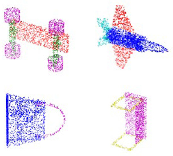 Compared with classification, part segmentation is a much more challenging task. The proposed method was evaluated on the ShapeNet dataset [22]. ShapeNet dataset is composed of 16,881 shapes with 16 categories, which are labeled with 50 parts in total. Following the data splitting operation in [6], 2048 points were randomly picked as the input of the proposed network. Furthermore, the part segmentation performances were compared using the average category mIoU and the average instance mIoU.
