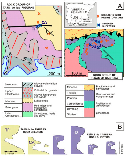 The Rock Group of Peñas de Cabrera is located within the municipal boundary of Casabermeja, in the interior of the Málaga province (southern Spain) (Figure 1A). Most rock shelters are sited on the northern flank of a thick succession of sandstones which ends in a small hill (570–620 m above sea level) which is located on the southern side of the Lower Miocene Colmenar Depression. The sandstones are arranged in meter-thick beds which generally are folded with dips that slightly exceed 30°. However, at some points, such as where rock shelters with paintings are found, sandstones appear as blocks with chaotic distribution, being arranged vertically and even seem to be inverted with some frequency. The degree of tectonic fracturing of sandstones is very high, showing a dense network of faults and diaclases with preferential N260°E and N orientation. Given their affinity with the Germanic facies and the lack of fauna in the study area, the Permo-Triassic age has been assigned to these sandstone beds [25]; thus placing them in the Andalusian domain precisely in contact with the flysch of the Colmenar Unit. The Rock Group of Peñas de Cabrera is formed of a total of 23 well-known rock shelters of smaller dimensions facing N, NW, and W. It contains a series of post-Palaeolithic paintings (Chalcolithic) which can also be assigned to the “schematic” style, with an abundance of anthropomorphic and idiomorphic representations, idols, tectiforms, and arboriforms [26].