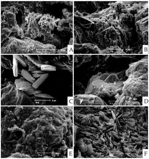 An example of this phenomenon can be observed in Figure 5A,B, with feldspar crystals altered by carbo-hydrolysis and kaolinite crystals neoformed as the result of the alteration. It is precisely the abundant presence of kaolinite (Figure 5C) in the Tajo de las Figuras samples which corresponds to the high humidity level in this location since this authigenic mineral has been commonly employed as an indicator of wet climates [35]. The availability of water is very important in the development of the chemical weathering processes [36], since the solubility of the feldspars is very low (e.g., 3 × 10−7 mol for the K-feldspar and 6 × 10−7 mol/L for the Na-feldspar) [37] its saturation is reached rapidly and the dissolution of feldspars needs a continuous renewal of under-saturated water.