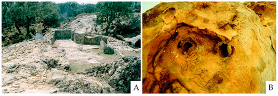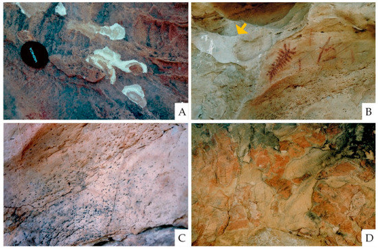The previous paragraphs focus on the main natural weathering processes detected in the host sandstones. Nevertheless, it is important to emphasise the influence of anthropogenic action on the state of conservation of the paintings. Both in the Tajo de las Figuras and Peñas de Cabrera sites, the signs left by visitors when wetting and rubbing the paintings in order to bring up the chromatic contrasts in the artistic features are evident. This action considerably increases the effect of the wetting-drying cycles of the host rock. The effect produced by the continuous rubbing of the walls and floors is unquestionable; this is particularly noticeable in the floor of the Cueva del Tajo de las Figuras [26,27,28]. Other deterioration effects resulting from human activity are: (1) fires lit in the shelters, which have caused the rock surfaces to become black; and (2) removal of blocks of sandstone (Figure 7A), which has left despoiled areas where the water accumulates and where organic soils are produced. These actions can considerably favour the natural processes of rock alteration (e.g., shelter 13, Peñas de Cabrera). Animal activity has also caused deterioration both in the host rock and in the paintings. The presence of wasps’ nests (Figure 7B) and the influence of birds, bats, goats, and deer is evident with defecations in the interiors of the shelters (Figure 6B) and rubbing against the walls.