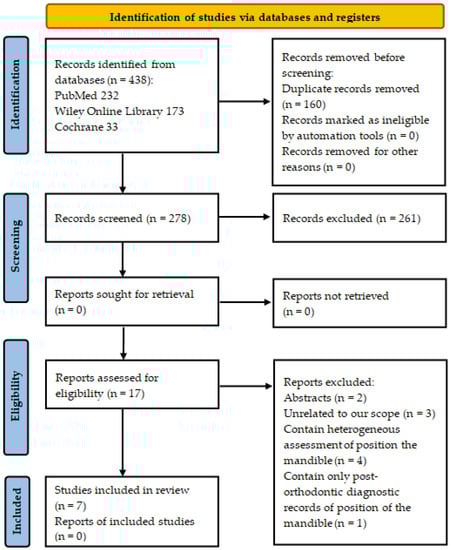 The electronic search of selected databases identified a total of 438 records: 232 articles were found in PubMed, 173 in Wiley Online Library, and 33 from Cochrane. 278 remained after removing duplicates of searched databases and 17 remained after reading the titles and abstracts. The latter ones were assessed for eligibility and 10 of them were excluded for not meeting the inclusion criteria. Finally, seven were included in this systematic review and their risk of bias and quality of evidence were assessed. The flow diagram of the selection process of the studies according to the PRISMA guidelines is shown in Figure 1 [].