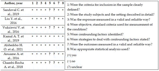 Two studies [,] were judged as with a low risk of bias and five with moderate risk [,,,,]. Regarding the questions “Were confounding factors identified?” and “Were strategies to deal with confounding factors stated?”, only two studies [,] provided clear details about the confounding factors and methods to deal with them. Further information about the risk of bias classification criteria is described in Figure 2.