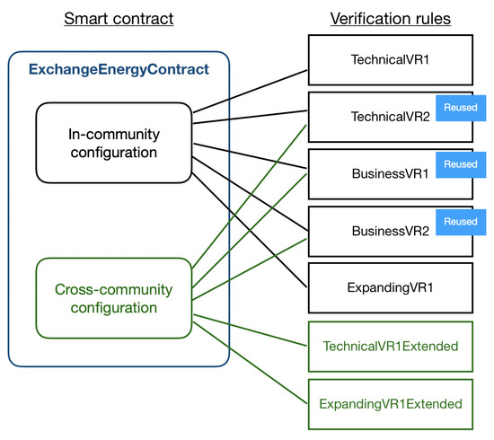 So, in the renewable energy example, for the first Exchange Energy smart contract , while for the second Buy Energy From Grid smart contract . The given example shows that the level of reuse can be high. Especially between smart contracts in a specific business context. Reuse may be more likely to involve technical rules as well as basic business ones. However, it seems reasonable that the verification rules should be as simple as possible. Therefore, it is purposeful to construct them as simple, single logical conditions. Such an approach will enable the easier reusability of verification rules in various smart contracts within a distributed application or business domain.