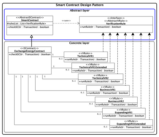 Figure 5 depicts the pattern’s layers with generic constructs (interface and abstract class) and concrete both smart contract and verification rules classes.