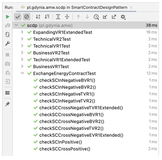 Test automation is prepared using the JUnit v.5.7. Automated tests can be executed at various levels. Tests can be run for separate verification rules, the smart contract class, and the whole package. An example of unit test execution results for the whole ExchangeEnergyContractTest class are shown in Figure 6.