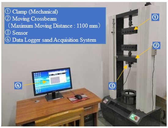 This section summarizes the tests involved in the program. Detailed specimen dimensions, testing schemes, and laboratory procedures are discussed. It should be noted that all sample tests were conducted in accordance with “Geotextiles and geotextile-related products—Strength of internal structural junctions—Part 1: Geocells” (ISO 13426-1-2019) and “Geosynthetics in railway engineering—Part 1: Geocell” (Q/CR 549.1-2016). The samples were tested by the geosynthetics electronic strength tester (Figure 1) in an environment with a temperature of (23 ± 2) °C and a relative humidity of (50 ± 5) % to avoid the influence of environmental factors. During the test, the number of samples prepared for each test scheme was at least 5, and the tensile rate was 50 mm·min−1.