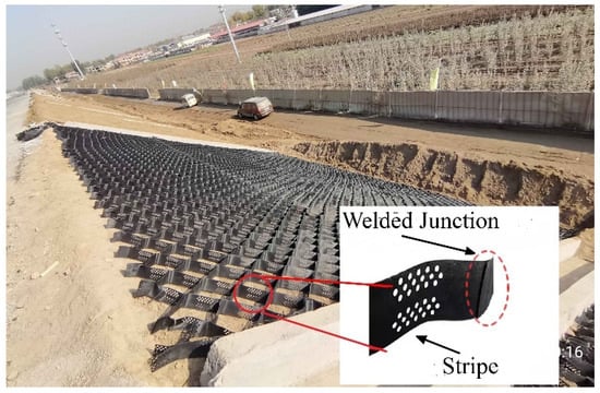 Geocells have been widely utilized in geotechnical engineering for a long time due to their effective reinforcement performance and obvious economic benefits, such as pavement [1,2,3], embankment [4], foundation [5,6], and slope protection [7,8]. The geocell’s three-dimensional honeycomb structure provides more lateral constraints than other planar reinforcement materials, which, when combined with the filling material, shapes a composite reinforcement with high strength and stability, further improving the structure’s overall reliability and service life [9].