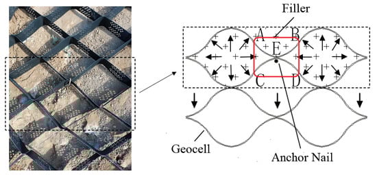 Geocells are typically subjected to gravity loads from the infill materials on steep slopes [22]. The force diagram of the geocell on the slope is shown in Figure 4. The geocell junctions have the critical features that support and transfer the load. The geocells are affected by the filling materials in all directions, resulting in four forms of failure at the junctions: