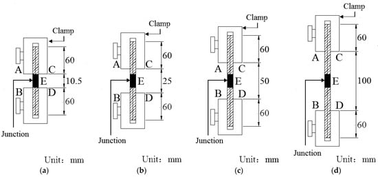 Four types of tensile tests were carried out on the geocell junctions. According to “Geosynthetics in railway engineering—Part 1: Geocell” (Q/CR 549.1-2016), the overall length of the sample was 220 mm, the width of the sample was the strip width of the geocell (the height of the geocell), and the clamping distance was 100 mm when the sample was tensioned after the preload was applied. The schematic drawings in Figure 5, Figure 6, Figure 7 and Figure 8 show the detailed configuration and loading scenario. Combined with the standards and relevant scholars’ research, the distances between clamps of 10.5 mm, 25 mm, 50 mm, and 100 mm were utilized in the experiments to explore the effect of clamping distance on different types of junction tensile testing. These distances ensure that no pre-load is applied to the specimen before the actual test begins. The specimens used in all the tests were initially cut to the correct size for the tensile test. It should be mentioned that stretching with a clamping distance of 10.5 mm was difficult due to the method of the splitting and peeling strength tests, as well as material considerations. Additional samples were tested as necessary to facilitate a high level of consistency. The detailed specimen sizes for the junction test are summarized in Table 2. The types of geocell junction tests include the weld tensile strength, tensile shear, peeling, and splitting tests. This study is intended to supplement and unify test standards as well as to provide a test scheme and data support. There can be a test basis when the geocell specification cannot be tested according to existing standards and the clamping distance needs to be increased or reduced.