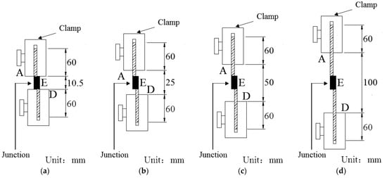 Tensile shear tests under different clamping distances: (a) 10.5 mm, (b) 25 mm, (c) 50 mm, (d) 100 mm.