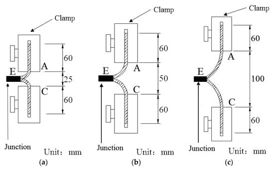 Peeling tests under different clamping distances: (a) 25 mm, (b) 50 mm, (c) 100 mm.