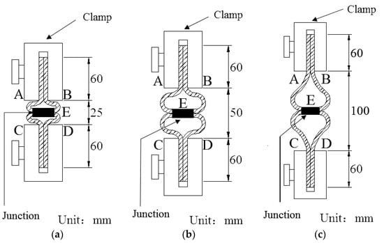 The failure modes of the junctions under tensile loading at different clamping distances can be observed in Figure 10. The failure modes of all the samples are similar. The fractures occurred at the spot-welding junction, and the strips had no visible change. This indicates that, during the tensile test, when the geocell strip has not begun to deform significantly, the junction is damaged first, and the strip’s stress has not reached its yield strength, which is consistent with the results reported by Tarip [23], where they found that the welded junction has a lower tensile strength than the high-density polyethylene (HDPE) material itself.