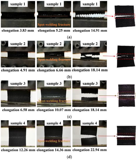 The failure modes of the samples under a shear force are shown in Figure 12. The results in Figure 12 indicate that the test procedure was characterized by apparent elongation deformation and a thin neck phenomenon of the strip. The two strips had no separation at the welding area, and the failures occurred at the connection between the welding junction and the strip. The welded junction is unlikely to fail when subjected to a shear force, and the actual shear strength of the junction should be higher than the shear yield stress obtained in the tests. It can also be found that the failure modes of the samples with a distance of 10.5 mm between the clamps were the ductile failure at the connection between the welded junction and the strip, and the increase in elongation caused the strip to separate from the junction (Figure 12a). Brittle failure appeared at the connection when the distance between the clamps was increased to 25 mm or 50 mm. The sample displayed a sudden general fracture failure after the elongation reached a specific degree (Figure 12b,c). When the clamping distance was increased to 100 mm, the sample failed as a result of a sudden brittle failure of the entire connection (Figure 12d). The reason for analyzing these fracture modes can be attributed to the characteristics of the welded junction. Two strips of ultrasonic spot welding form the welded junction, and the perforated area creates a weak area and is prone to stress concentration. The shear force of the junction becomes more like the tensile force on the strip as the clamping distance increases. The strip is stretched and hardened, and there are disparities in the changes at the junction, resulting in the sudden brittle failure of the connection between the junction and strip due to stress concentration.