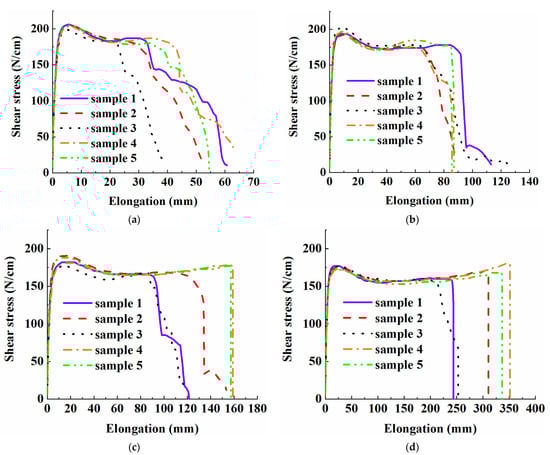 Shear stress–elongation relationship of the junction subjected to shear force under various clamping distances: (a) 10.5 mm, (b) 25 mm, (c) 50 mm, (d) 100 mm.