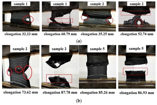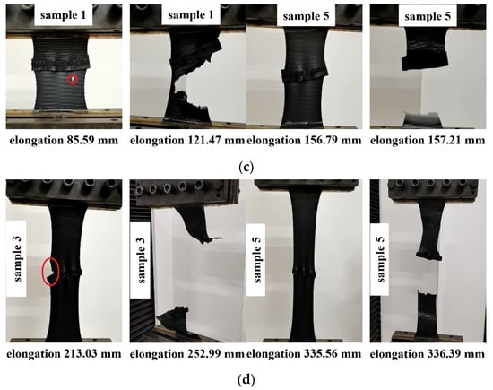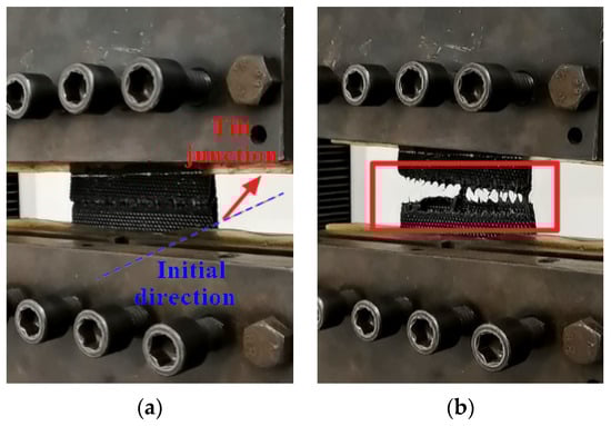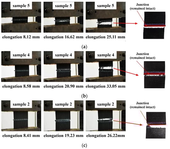 However, the experiment results showed various failure modes (Figure 18b). The sample failed at the junction between the two sides of the junction and the strip, which was identical to how the peeling strength test fails. This was due in large part to the sample’s stress changing during the tensile process. It can be found from the test that the junction tilted under a splitting force (the red arrow in Figure 18a; the dashed line is the junction’s initial direction), changing the force of the junction from a simple splitting force to a combination force of shear and splitting.