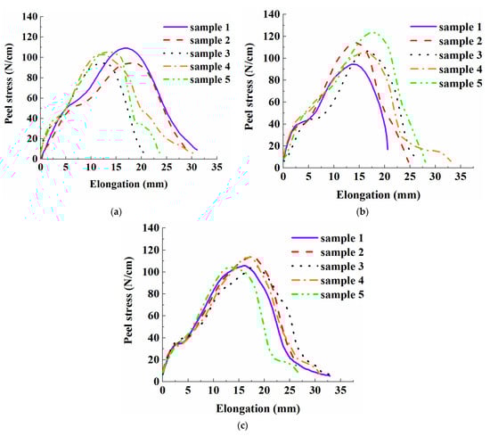 Peel stress–elongation relationship of the junction subjected to a peeling force under various clamping distances: (a) 25 mm, (b) 50 mm, (c) 100 mm.