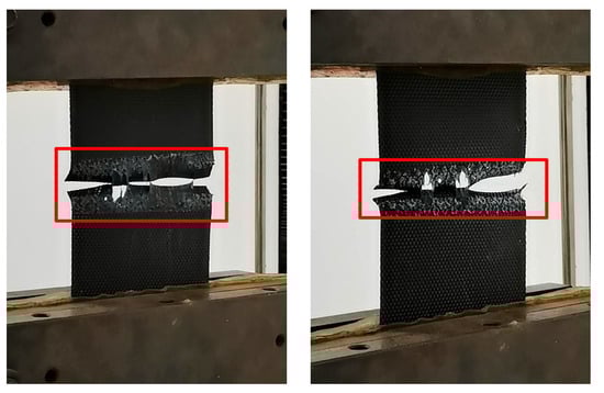 In addition, the failure modes of the samples revealed the existence of strip damage (Figure 12a (sample 2) and Figure 12c (sample 1)). The different failure patterns can be attributed to the indented surface. According to Meuller, the surface structure of the HDPE composite influences its post-yielding behavior; more rapid failure can occur at the locations of stress concentration due to surface structural features, such as notches [24]. The deeper indentations served as the equivalent of notches for geocells. It is worth noting that these findings are consistent with the shear stress–elongation curve.