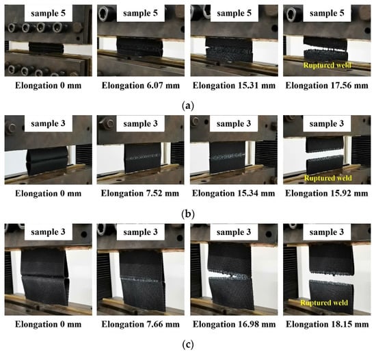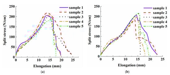 Figure 16 exhibits the graphs of the split stress–elongation of the junctions under different clamping distances. All of the results show a similar nature. The splitting strength in the linear area pre-peak increases slowly, and the strength in the area post-peak decreases more rapidly. This is consistent with the peeling strength test, indicating that the loading process is mostly similar between the two tests. The failure processes of the sample photographed are shown in Figure 17. The two welded strips separated, with progressive ductile failure and sudden brittle failure, which matched the test curve well.