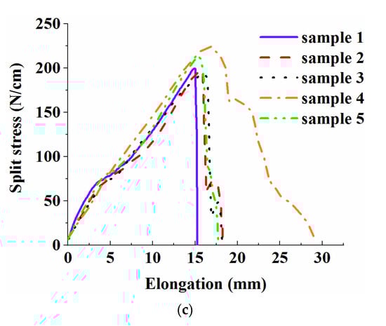 Split stress–elongation relationship of the junction subjected to a splitting force under various clamping distances: (a) 25 mm, (b) 50 mm, (c) 100 mm.