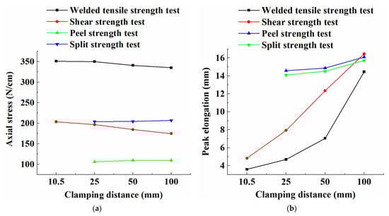 - The shear strength of the tensile shear test decreases with the increase in the distance between clamps. The shear strengths of the 100 mm clamping distance were decreased by 14.08% compared with those of the 10.5 mm clamping distance. The pre-peak elastic and post-peak plastic area elongation both increased significantly.