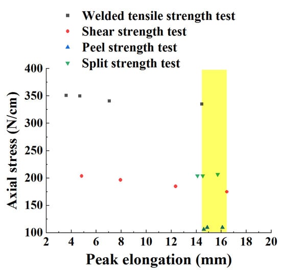 The elongation required for four types of tests to attain peak strength increases with the clamping distance, as shown in Figure 19b, and the weld tensile and shear strength tests are more obviously affected by the strip. Comparing the four types of testing, the elongation required for the peel strength test to reach the peak is the largest at the 25 mm and 50 mm clamping distances; the peak elongation of the shear strength test is the largest at the 100 mm clamping distance. In addition, under the 100 mm clamping distance, there is minimal difference in the peak elongation of the tests (highlighted area in Figure 20). It is further confirmed that the peeling force is easily capable of causing geocell destruction.
