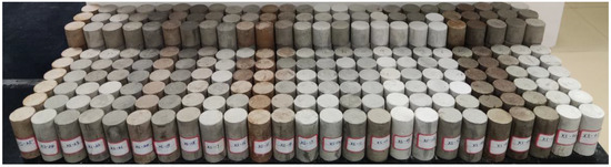 A total of 25 groups of tests were designed for this experiment, each of which required wave velocity detection, uniaxial compression, direct shear and splitting tests. The sample size used for wave velocity detection was the same as that used for the uniaxial test or direct shear test, and no new sample preparation was needed. To reduce the error, the average value was taken as the final result, including 3 specimens in the splitting test group, 3 specimens in the uniaxial test group, 6 specimens in the direct shear test group, and a total of 225 long cylindrical specimens (ϕ 50 × 100 mm) and 75 short cylindrical specimens (ϕ 50 × 50 mm), as shown in Figure 1.