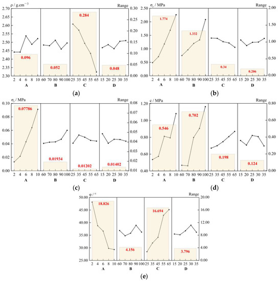 Based on the orthogonal test results, a range analysis was conducted on the five static parameters, and a range analysis diagram was drawn, as shown in Figure 2. In the figure, the broken-line graph represents the average value of the test index, and the bar graph represents the range. The results for sensitivity to the four influencing groups, cementing material/solid material (A), gypsum/cementing material (B), quartz sand/aggregate (C) and ferric concentrate powder/(barite powder + ferric powder) (D), were C > A > B > D for density, A > B > C > D for pressure strength, A > B > D > C for tensile strength, B > A > C > D for cohesive force and A > B > C > D for internal friction angle.