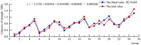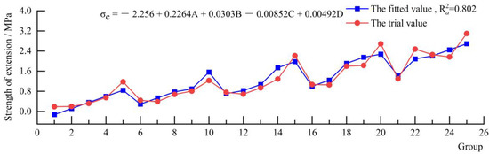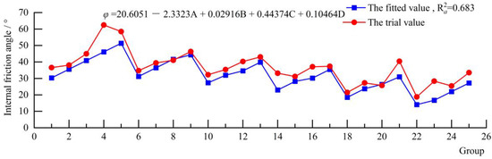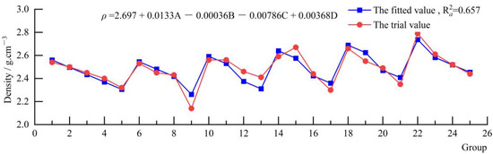 According to the results of the orthogonal test and multivariate linear regression model, four relationships can be established between the database for the seven parameters (density, tensile strength, compressive strength, cohesive force, internal friction angle, dynamic shear modulus and dynamic elastic modulus) and the four variables (cementing material/solid materials (A), gypsum cementing material (B), quartz sand (C) and ferric concentrate powder/(barite powder + ferric concentrate powder) (D). Multivariate linear fitting by SPSS software was used to determine the model of each parameter. The formula in Figure 4, Figure 5, Figure 6, Figure 7, Figure 8, Figure 9 and Figure 10 expresses the corresponding relationship between seven physico-mechanical parameters and four groups of similar material ratios, and the value before the four groups of similar material ratios indicates the influence degree of this factor on the parameters. The red dashed line represents the test value in the orthogonal test, and the blue dashed line represents the value calculated by fitting the above formula. Since there were many variables in the multiple linear regression model, the modified determination coefficient () was used to reflect the fitting degree of the model.