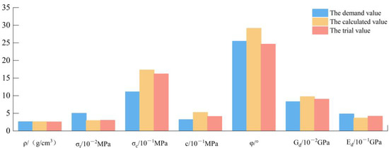 According to the values of the physico-mechanical parameters of the model materials, combined with the relevant fitting formula and sensitivity analysis results of each factor, MATLAB programming was used to calculate the optimal ratio of components in the model material using the following formula: