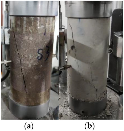 Comparison of failure modes under uniaxial compression. (a) Sandstone sample; (b) model material.