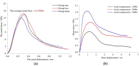 As shown in Figure 13, during the process of uniaxial compression of model materials similar to sandstone, the model material underwent an elastic stage and an elastic–plastic stage and finally reached the brittle failure stage. In the direct shear process of model materials similar to sandstone, with the increase in axial force, the peak shear strength and the residual strength increased and were much less than the peak shear force.