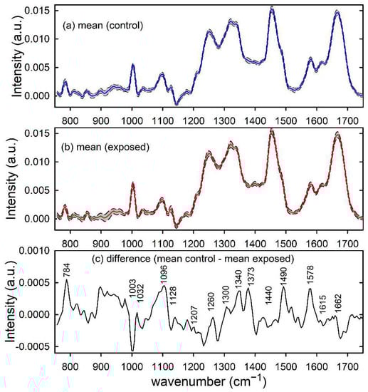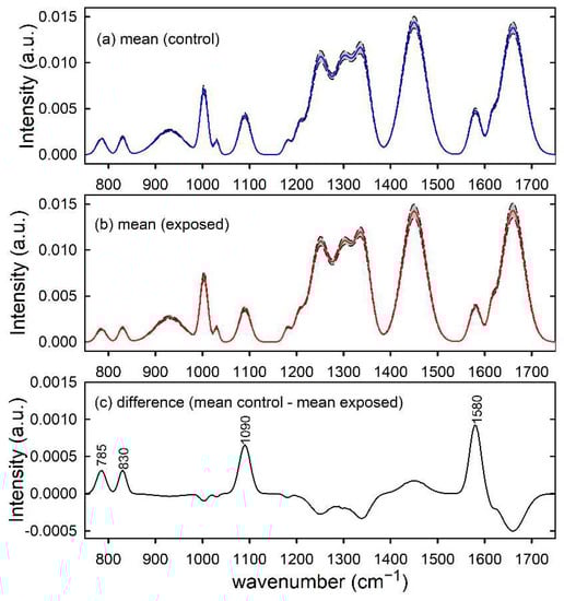The following supporting information can be downloaded at: https://www.mdpi.com/article/10.3390/app12115345/s1, Table S1: Values of spectral parameters amplitude (Ai), wavenumber (x0i) and broadening (σi) for each Gaussian peak of the basic control-like and exposed-like vibrational spectrum.