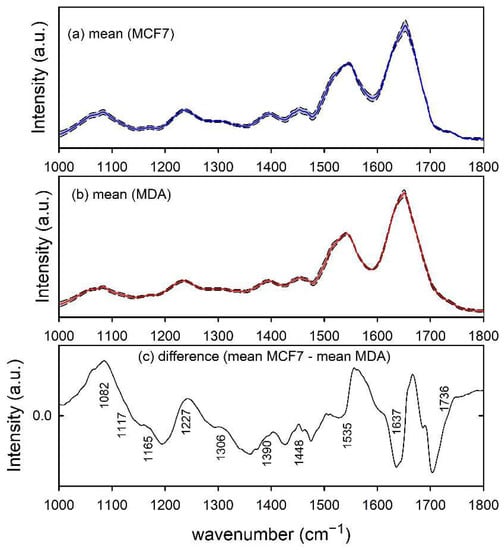 Furthermore, the infrared absorption spectra of MCF7 and MDA cells, shown in Figure 3a,b, respectively, are characterized by spectral peaks and bands related to nucleic acids (1082, 1117 and 1227 cm−1), proteins (1165, 1306, 1390, 1448, 1535 and 1637 cm−1) and lipids (1390, 1448 and 1736 cm−1). The difference spectrum in Figure 3c indicates that the two types of cells can be biochemically discriminated according to the larger relative amount of nucleic acid content in MCF7 cells with respect to MDA ones, as suggested by the spectral peak at 1082 and 1227 cm−1, whereas the peaks at about 1535 and 1637 cm−1 are due to a relative spectral shift of the amide II and I band for the two types of cell [28]. Both such results are in good agreement with those reported in the literature. In particular, both Talari et al. [32] and Abramczyk et al. [33] found a larger relative amount of nucleic acids in the MCF7 cells with respect to MDA cells. As for the shifts of amide I and II bands, they might be connected with changes in the secondary protein structures occurring during the process of carcinogenesis [28].