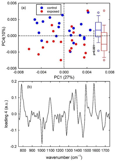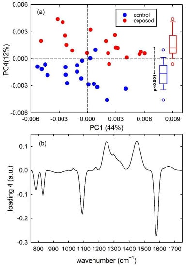 PC4 vs. PC1 score plot (a) for the synthetic control (blue dots) and exposed (red dots) vibrational spectra. The box plots of the PC4 score values are shown on the right side of (a): the results of the t-test point out that the two distributions of score values are significantly different (p < 0.001). Loading 4 spectrum is reported in (b).