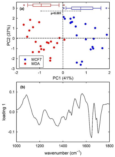 Finally, PCA results for the dataset of MCF7 and MDA cells are shown in Figure 6. For the FTIR spectra of this dataset, the first 7 principal components carried around 97% of all the spectral variation found in the whole dataset. The score plot in Figure 6a highlights that PC1 well discriminate the metastatic MDA cells from the malignant MCF7 ones, with almost no overlapping score values. In particular, MCF7 and MDA cells have positive and negative, respectively, PC1 score values and the box plots at the top of Figure 6a demonstrates that the two distribution are statistically different, according to t-test analysis. Furthermore, the loading 1 plot in Figure 6b is very similar to the difference plot in Figure 3c, indicating that MCF7 cells (positive score) have a large relative content of nucleic acid components (positive loading bands at about 1085 and 1230 cm−1) with respect to MDA cells, whereas the spectral features in the 1500–1700 cm−1 range are related to the shift of the spectral position of amide I and II bands for the two types of cell.