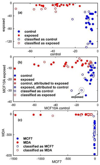 Hence, following the PCA, linear discrimination analysis was first performed. The first seven PC scores of the calibration set of simulated spectra were used as input data for LDA to build a diagnostic model that will be used for the classification of unknown spectra. The PCA-LDA model correctly classifies all the 36 spectra, as visible in the classification plot shown in Figure 7a (filled circles). In fact, a discriminant score for the attribution of an object (spectrum) to each class is calculated and the object is assigned to that class for which the discriminant score is the largest. Hence, in Figure 7a samples lying close to zero for a class are associated with that class. Instead, the accuracy of the PCA-LDA model for the classification of Raman spectra from unexposed and proton-exposed MCF10A cells, shown in Figure 7b is 87.5%. Indeed, such a model, obtained by using the first seven PC scores of the calibration set as input for the LDA model, erroneously attributes some samples of the calibration set to a different class from the one they actually belong to, as visible in Figure 7b from the circle crossed samples. In particular, 4 control spectra were attributed to exposed class and 1 exposed spectrum was attributed to control class. Lastly, a 100% accuracy is obtained for the PCA-LDA classification model related to MCF7 and MDA cells, as visible in Figure 7c.