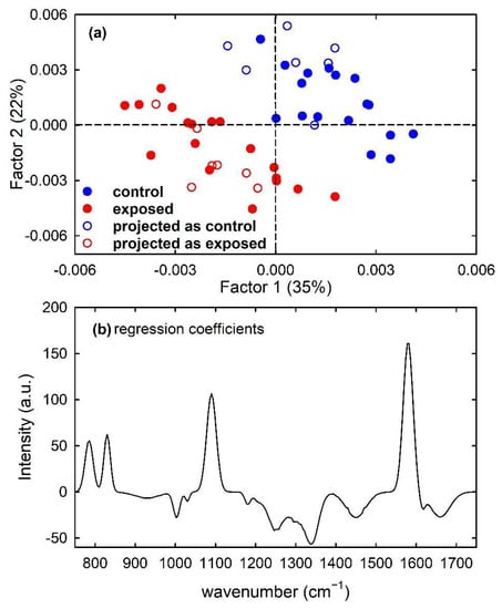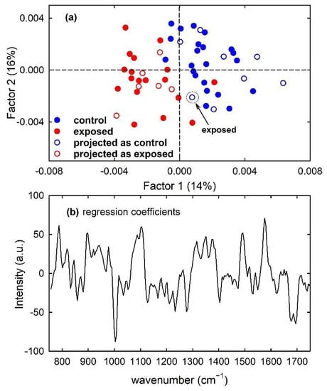 Furthermore, a PLS model was built for the calibration set of simulated spectra by using 7 latent variables. Clear discrimination of the control and exposed spectra is visible in Figure 8a, which shows (filled circles) the score plot of Factor 1 and Factor 2 of the PLS model. In particular, the separation between the two types of spectra can be observed along both factors. Such a feature is also confirmed by the plot of the regression coefficients, shown in Figure 8b for two components of the regression model. It can be deduced that the most important variables in the PLS model were those corresponding to wavenumbers around 780, 830, 1090 and 1580 cm−1, as expected because the spectral peaks centred at such wavenumber values are mainly responsible for the difference between the average spectra of control-like and exposed-like spectra reported in Figure 1c. The performance of the prediction ability of the built PLS model, checked by using just the samples from the test set, is summarized in Table 1. All the unknown samples were correctly assigned to the proper class, so producing maximum values of the performance parameters. Such results can be also visualized by reporting the projections of the test samples on the Factor 2 vs. Factor 1 score plot, shown as hollow circles in Figure 8a.